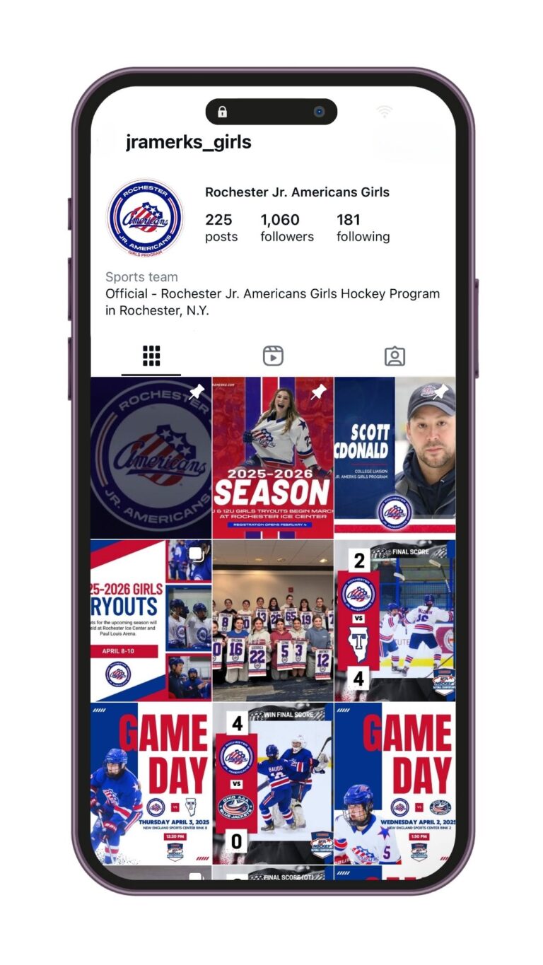 As part of my ad agency course, Technically Speaking, my team was asked by the Rochester Jr. Amerks to help promote their entire girls hockey program. We fully took over the organization’s Instagram, creating and scheduling posts that highlighted players, teams, and upcoming opportunities. Alongside the social campaign, we developed a brand video from the ground up—handling everything from storyboarding and scripting to shooting and editing.
